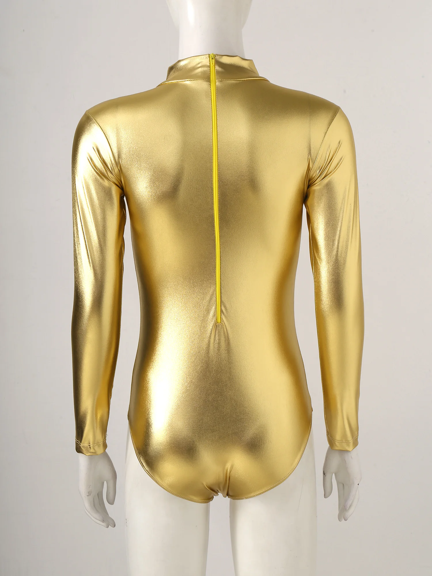 Женское гимнастическое искусственное платье, металлик, с длинным рукавом, для тренировок, женские костюмы для выступлений на сцене