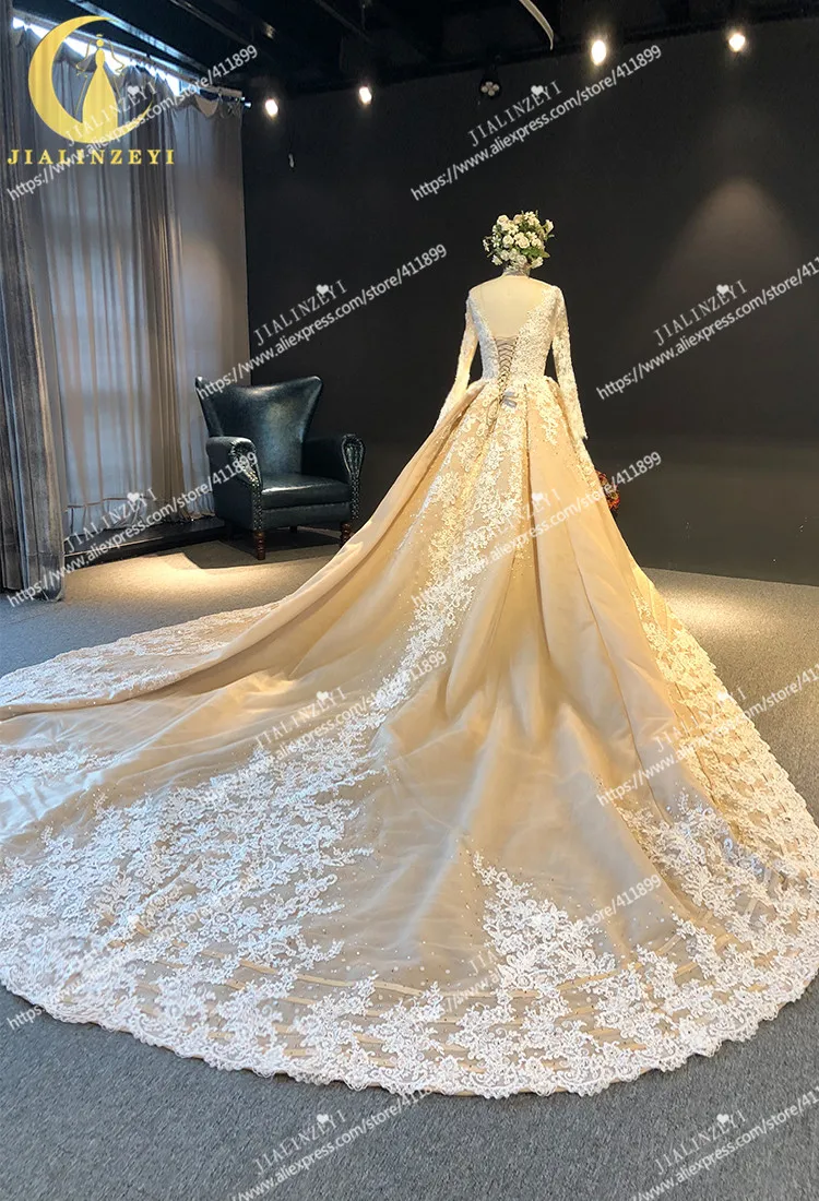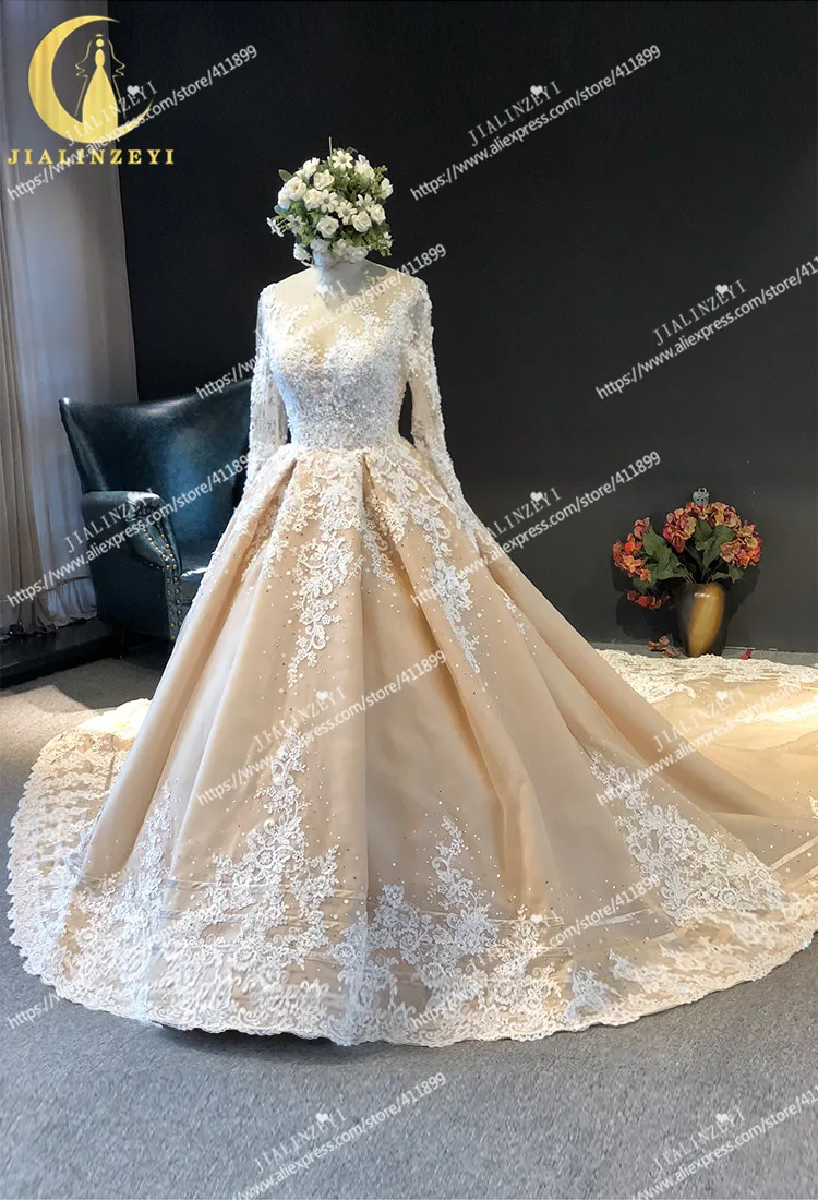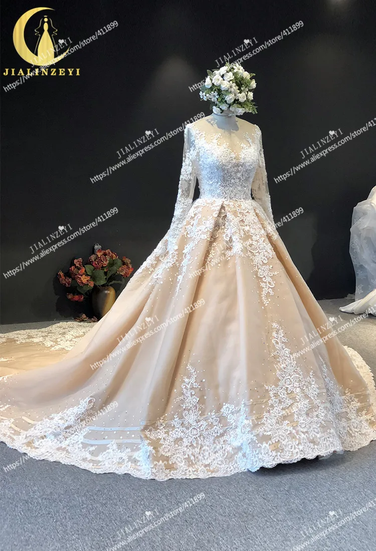 JIALINZEYI Настоящее фото длинное рукава, треугольный вырез, с кружевной аппликацией, с бисером с длинным шлейфом телесного цвета свадебные платья
