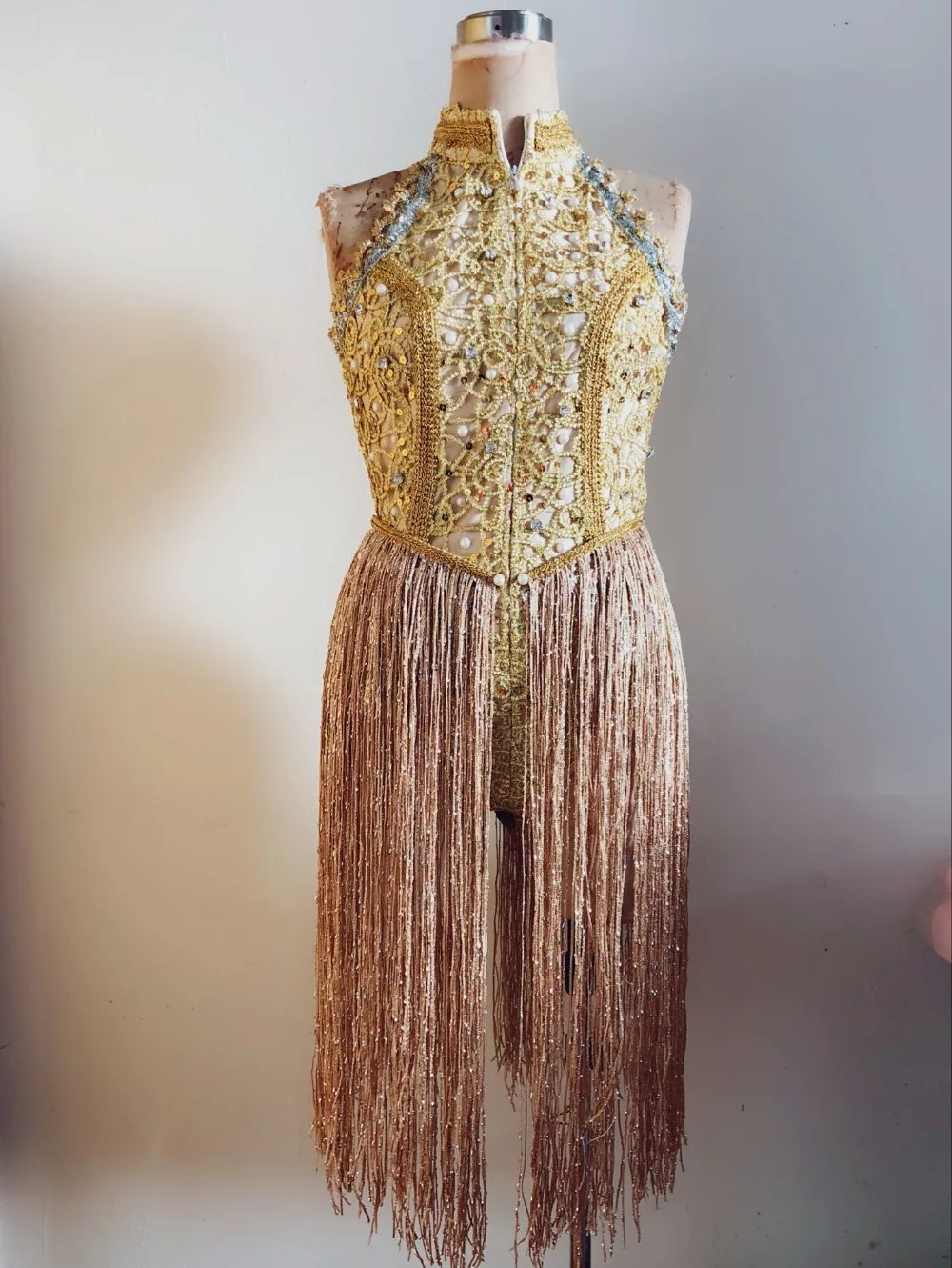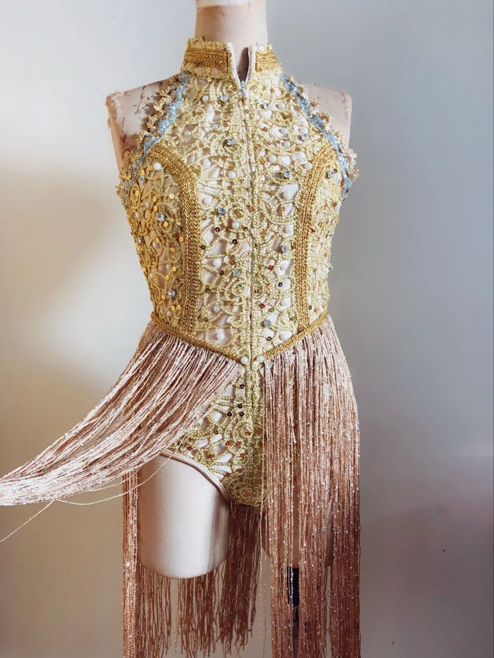Модные золотые Вышивка Жемчуг Стразы рукавов кисточкой Боди женские праздничный наряд бар шоу певица Одежда для танцев