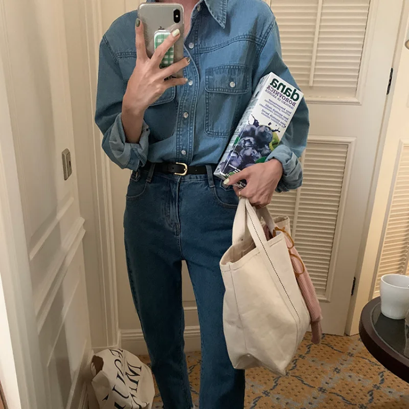Винтажная женская джинсовая рубашка QWEEK, Элегантная блузка в Корейском стиле с карманами, Топ с длинным рукавом, Женская Повседневная модная рубашка в стиле Харадзюку