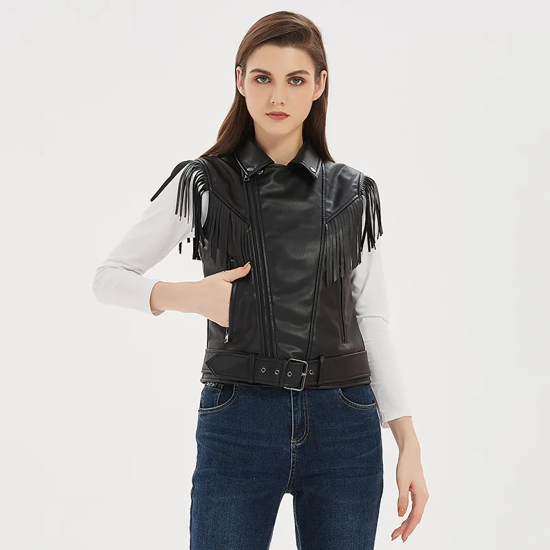 Осень 2023, Женский симметричный жилет из искусственной кожи с бахромой, уличная мода, кожаное пальто с лацканами, облегающая байкерская куртка, жилет