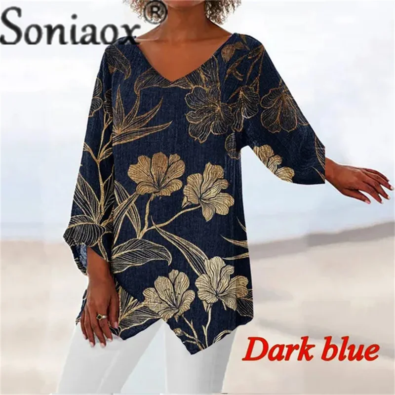 Пуловер женский с V-образным вырезом, Повседневная Свободная футболка с винтажным принтом, с рукавом три четверти, ассиметричный подол, на осень-зиму