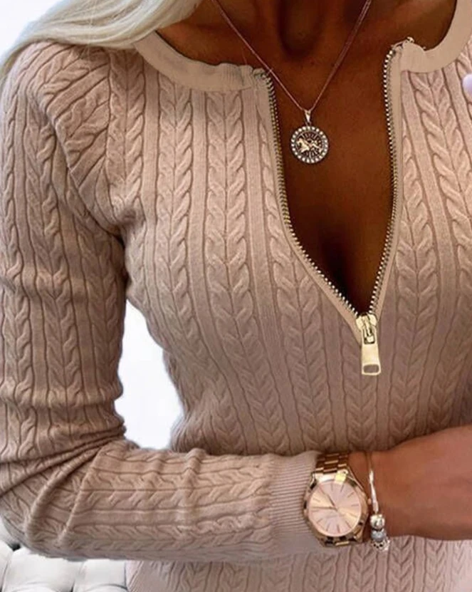 Повседневный модный теплый осенне-зимний темпераментный приталенный свитер с круглым вырезом и молнией, модель 2023 года, вязаный свитер для женщин