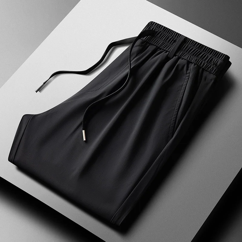 Простые повседневные летние однотонные мужские брюки из ледяного шелка с эластичным поясом и карманами, модные Универсальные свободные брюки